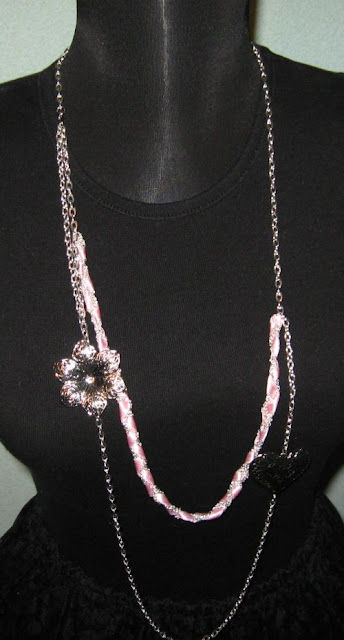 Descriere: Colier lung argintiu cu doua pandantive mari (o floare si o inima cu detalii filigran) si un lant foarte delicat cu insertii din material textil roz. Se poate aseza in diverse moduri la gat si este reglabil ca lungime. Se poate reface la cerere!