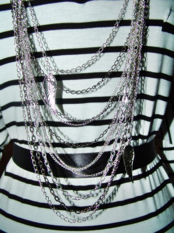 Descriere: Colier lung cu lanturi multiple argintiu si argintiu inchis (spre negru) de diferite grosimi, decorat cu aripi de inger si fleurs de lis. Se poate purta in mai multe feluri, oricum il veti aseza sau intoarece va arata bine! Se poate reface la cere!