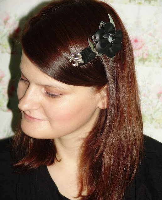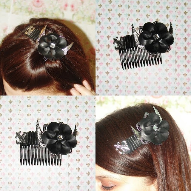 Descriere: Pieptan negru decorat cu o floare mare de piele neagra asezata pe o baza din metal argintiu (o alta floare lucrata in tehnica filigran), floarea de piele are...aripi de inger din metal argintiu, celalalt capat al pieptanul este impodobit cu volane din piele si un accesoriu metalic cu fleurs de lis, dimensiune: aproximativ 8.3/6.2 cm! Se poate reface la cerere!