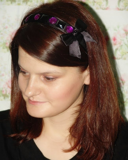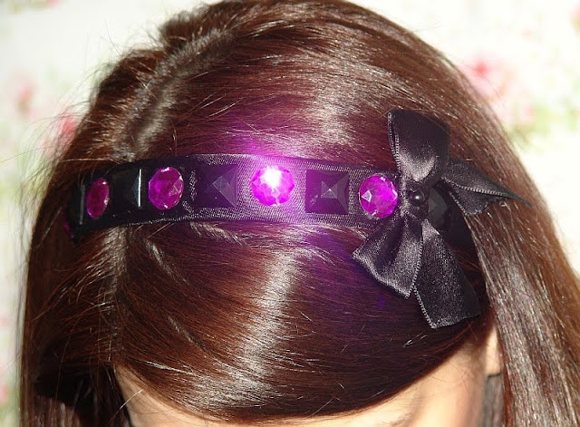 Descriere: Bentita lata din saten cu cristale rotunde mov (cu o usoara tenta de magenta), cristale patrate, negre si o funda neagra din saten inspirata de personajul Vanessa Abrams din Gossip Girl:).