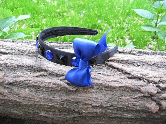 Descriere: Bentita lata din saten cu cristale rotunde albastru inchis, cristale patrate, negre si o funda albastru electric din saten inspirata de personajul Serena van der Woodsen din Gossip Girl:).