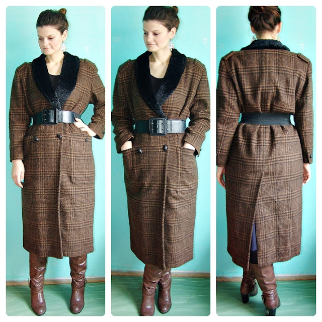 Descriere: Palton lung din lana si mohair in carouri (nuante de maro si negru), croiala usor masculina, aproape drept (foarte putin cambrat), se inchide in fata cu doi nasturi, are doua buzunare aplicate, mari care se inchisd cu nasturi, decolteu adanc in V marginit de un guler foarte frumos, negru, din lana de miel scurta, pe umeri are doua aplicatii din acelasi material tip epoleti, in spate are o crapatura de 57 de cm, are dublura neagra, stare excelenta!