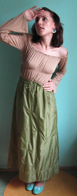 Descriere: Fusta lunga verde cu broderie florala din fir verde, materialul are aspect de fas, se inchide in lateral cu fermoar, silueta A, in talie poate fi stransa cu un siret elastic, este mai groasa, stare excelenta!
