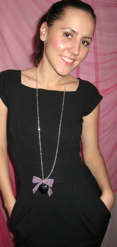 Descriere: Colier argintiu lung cu pandantiv mare in forma de inima din piatra naturala, slefuita, neagra si funda din dantela mov (lungimea lantului poate fi reglata).
