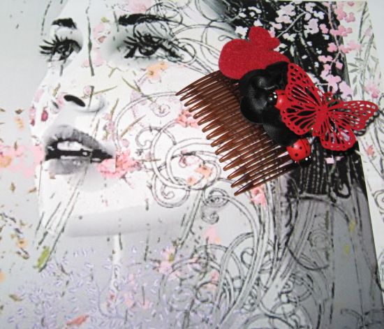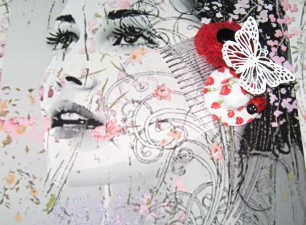 Descriere: Pieptan alb (usor transparent) decorat cu o floare din voal rosu cu miez negru, o plariuta cu capsuni pe care au poposit doua gargarite din lemn (mama si fica :) si un fluture alb (din metal usor cu detalii filigram) suspendat pe un lujer din margele negre (suportul aerian pe care este asezat fluturele este flexibil asa ca se poate aranja in mai multe feluri). Se poate reface la cerere!