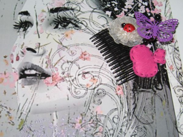 Descriere: Pieptan negru decorat cu un mar roz din fetru, o floare din voal alb pe care a poposit o gargarita din lemn si un fluture mov (din metal usor cu detalii filigram) suspendat pe un lujer din margele negre (suportul aerian pe care este asezat fluturele este flexibil asa ca se poate aranja in mai multe feluri). Se poate reface la cerere!